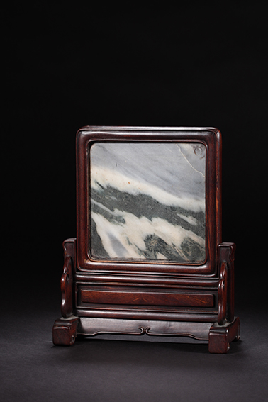 此插屏为红木而就,屏面镶嵌墨彩大理石,耸山峻岭、云雾缭绕,世外仙境,若隐若现,令人浮想联翩、叹为观止。整器做工精细,刻琢佳美,形制稳妥,包浆见古,甚为精美。