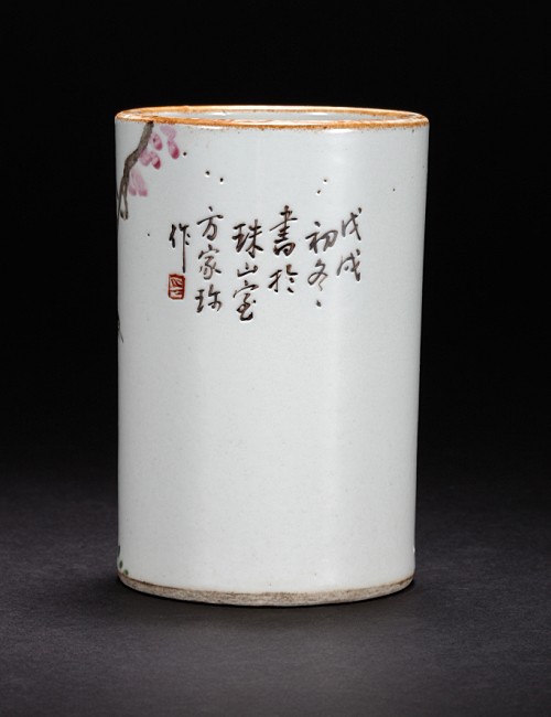 笔筒造型传统规范,小巧别致。酱口,笔筒通体浅绛彩装饰,外壁绘喜鹊登梅,线条简练,画风质朴,笔法娴熟。画面大面积留白,避免落入繁缛的俗套,清新淡雅。侧面落方家珍款和戊戌(1898)年纪年款。笔筒底部落矾红彩“松竹轩”行书堂名款。方家珍,生卒时间不详,其瓷画艺术创作主要活跃在光绪年间,曾在御窑厂供职,有大量作品传世。擅长人物、花鸟、动物、山水等题材,属于晚晴民国时期知名瓷画家。