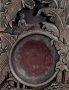 整砚紫红猪肝色,唯有砚表利用端砚以俏色蕉叶白,大面积浮雕芭蕉树丛,砚额两池,左侧端生一仕,芭蕉树随风飘动,仕女低头眼望一洼池水,水中倒映着圆月,仕女若有所思,也许她在思念远方的故人,更为精彩的是作者利用倒影的圆月做砚堂,整砚构思大胆巧妙,雕工精湛,栩栩如生,构图合理,仿佛是一幅中国的写意画,经典至极。