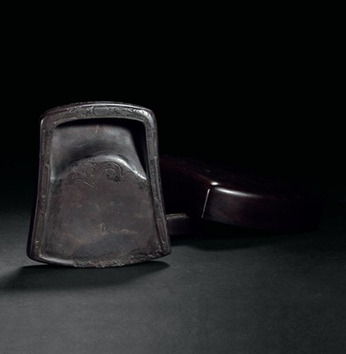 砚琢长方形,砚额浅浮雕祥云、牡丹、灵石花卉。边框微凸,砚堂微洼,墨锈颇厚,石色蓝中泛紫有翡翠斑、冻,晕、火捺等名贵纹理。石质坚致,潴水发墨,呵之即泽,研试如磨玉而无声此上品也。该砚配有海南黄花梨原木盒,更显珍贵。砚背镌楷书“故人遗我一片石,琢砚筑池食旧德。有时泼墨作云山,石友笑我烟霞癖。画师为写真须眉,忙鞵竹笠野人服。镌鑱自向虞山行,斫我砚田云五色”。款落“墨井道人吴历自题”。阴文印“渔山”。